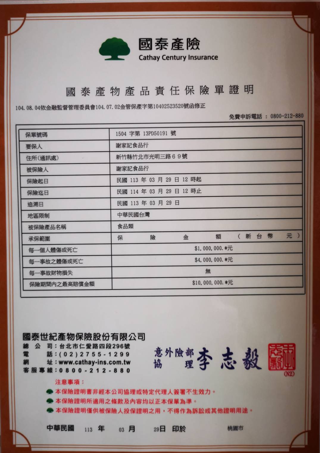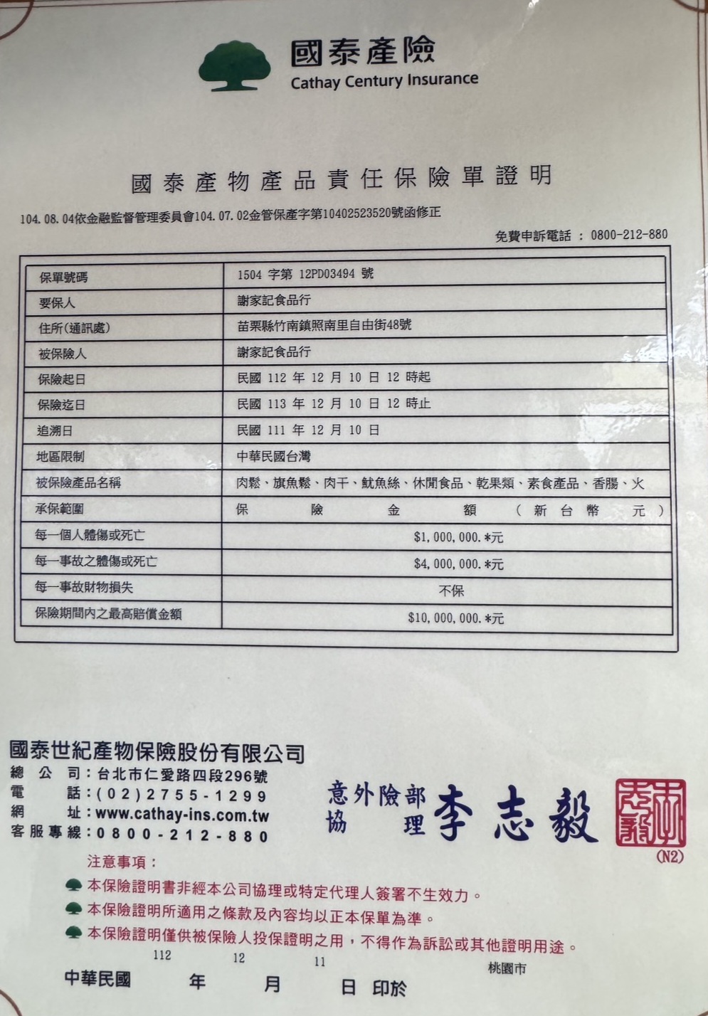 為保障消費者的飲食安全,本公司已投保產品責任險。